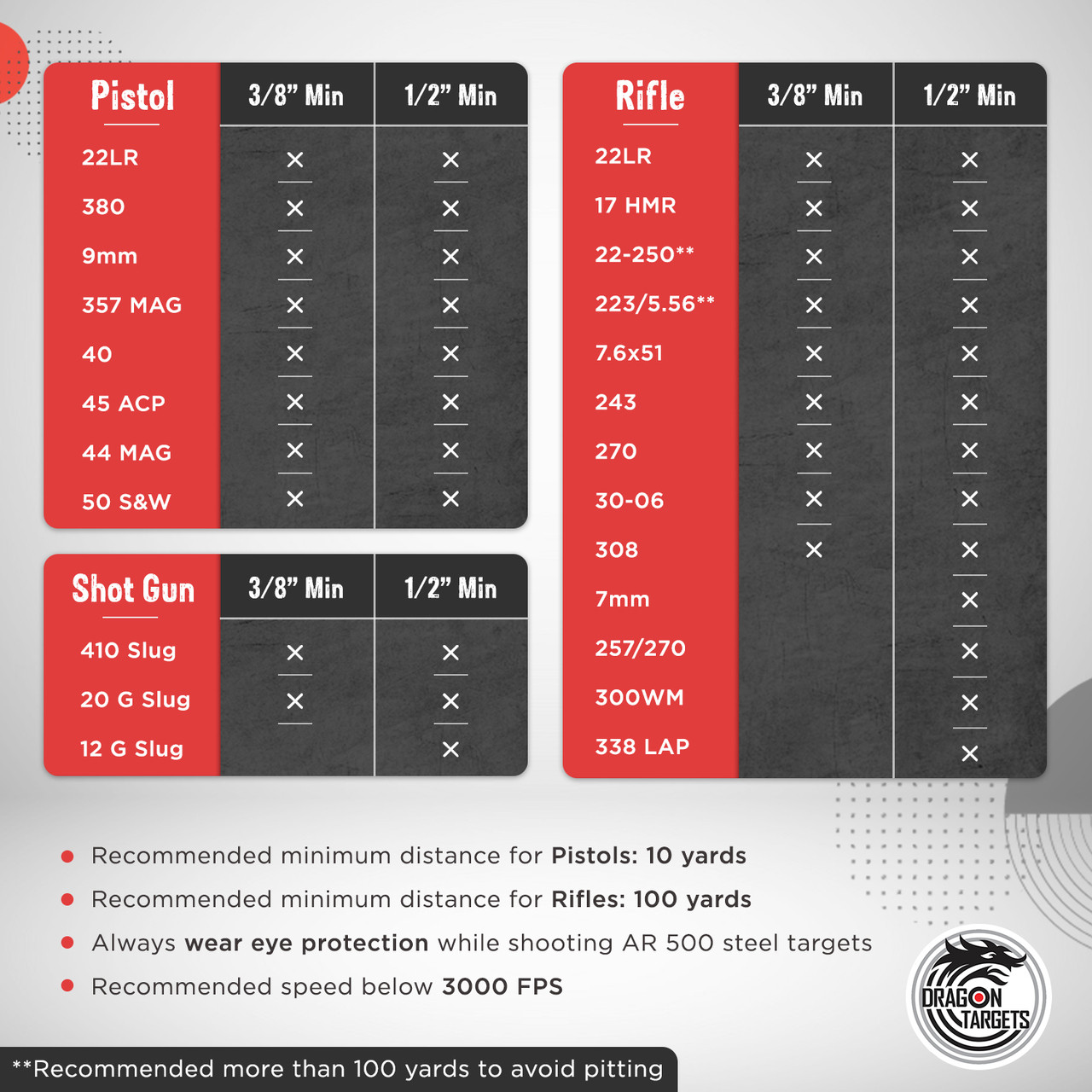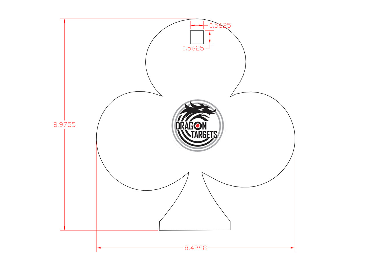 Professional grade AR500 steel shooting target by Dragon Targets. Get instant feedback when you hit a Dragon Target! When the targets are hit, they make a loud 'dinging' noise that lets the shooter know they are on point. See shooting chart for recommended distance and ALWAYS wear eye and ear protection while shooting at a Dragon AR500 Steel Target. Dragon Targets are made with AMERICAN AR500 Steel and finished in Texas. The Club Shaped Steel Target x 3/8" Thick is painted with a custom formulated paint to eliminate glare and maximize visibility. Targets are painted with a thin coat of custom target paint to eliminate distracting paint cracks. Simply paint over targets when done or a few minutes before a shooting session. The Club Shaped Steel Target x 3/8" Thick has two square holes to accept a ½" carriage bolt (not included) for hanging targets. Order today and start shooting like a pro!